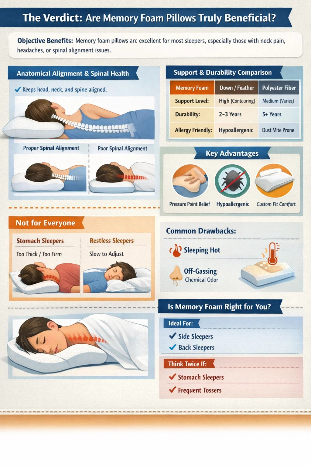 در حالی که آنها مزایای ارتوپدی قابل توجهی را ارائه می دهند، یک داروی جهانی نیستند. "خوبی" آنها تا حد زیادی به وضعیت خواب شخصی شما، تحمل گرما و حساسیت به بوهای مواد بستگی دارد. برای یک تخت خواب جانبی یا پشتی، بالش مموری فوم می تواند یک ابزاری متحول کننده برای بهداشت خواب ، در حالی که برای افرادی که معده می خوابند ممکن است آنها را خیلی محدود یا سفت بداند.