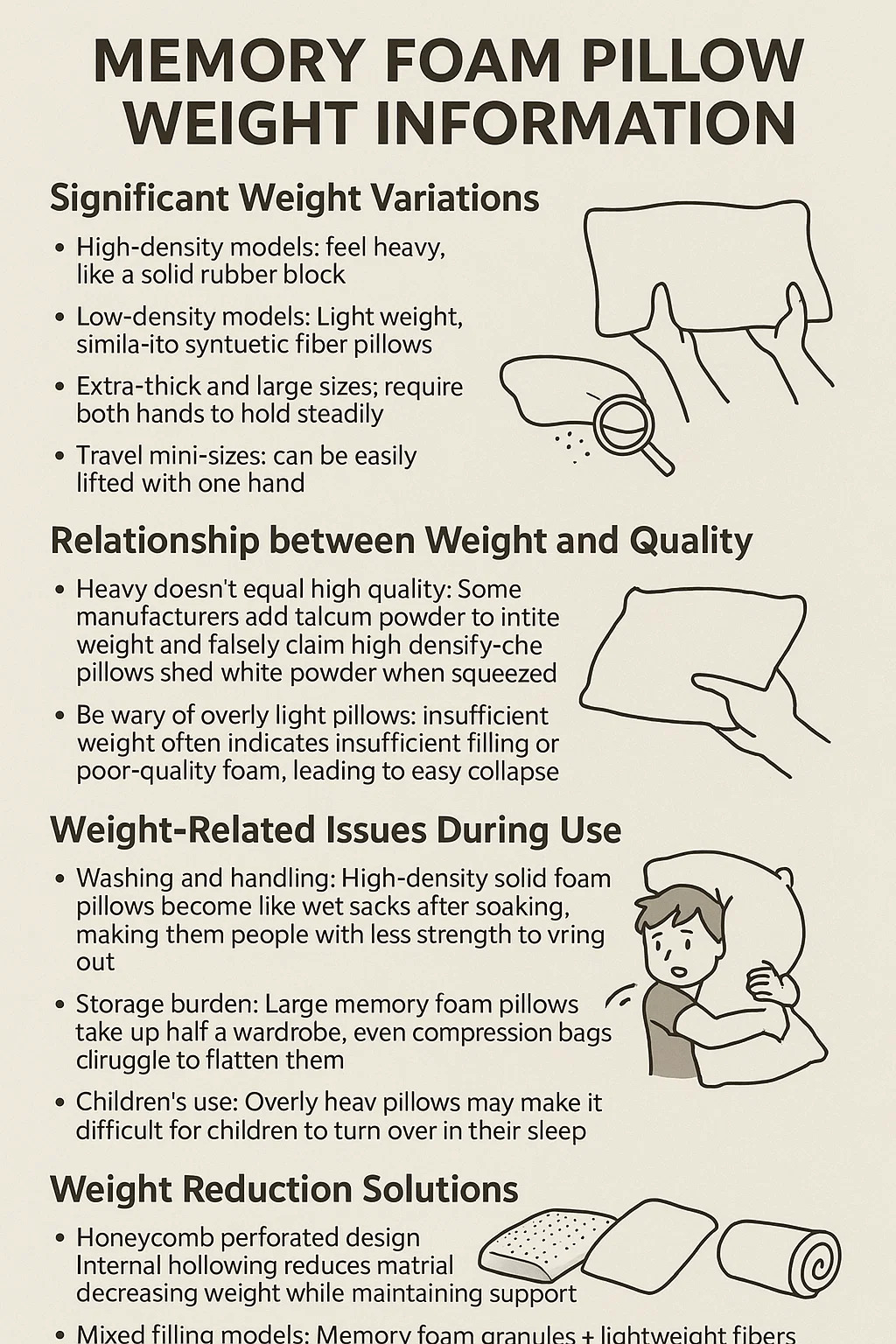 سنگین به معنای کیفیت بالا نیست: برخی از تولیدکنندگان پودر تالک را برای افزایش وزن اضافه می کنند و به دروغ ادعا می کنند که چگالی بالا دارد. این بالش ها وقتی فشرده می شوند پودر سفید می ریزند.