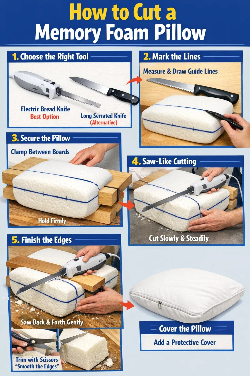 گاهی اوقات اگر الف بالش مموری فوم خیلی بلند است، یا می خواهید آن را به پشتی یا بالش مسافرتی تبدیل کنید، ممکن است لازم باشد از ابزارهای برش استفاده کنید. از آنجایی که مموری فوم ماده ای بسیار سخت و متراکم است، برش تصادفی آن می تواند به راحتی لبه ها را ناهموار و ناهموار کند.